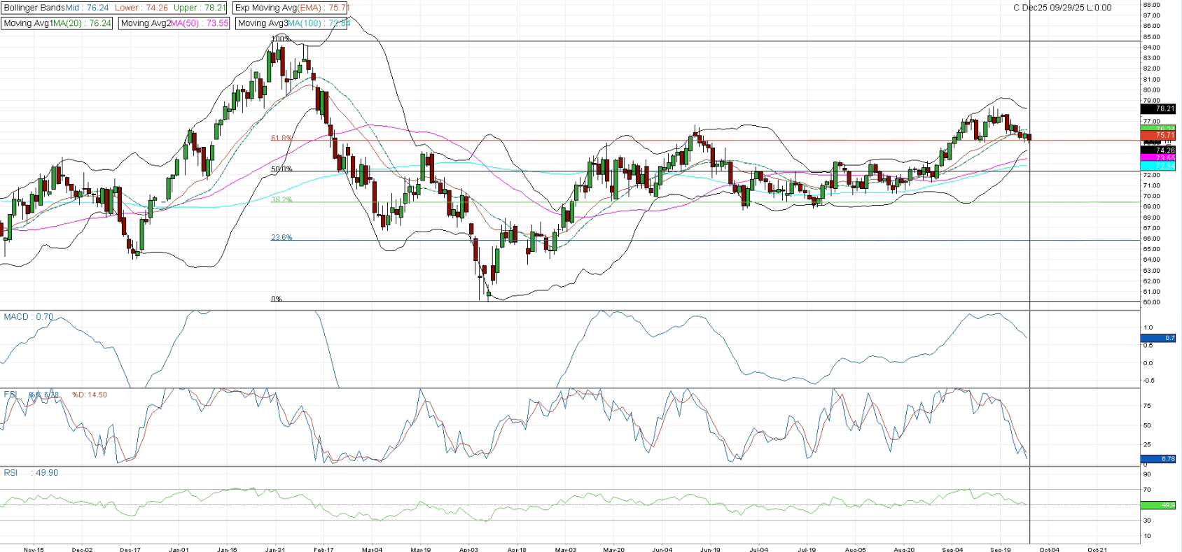 The EUAs December 2025 contract is currently trading near the 61.8% Fibonacci retracement level at €75.20, slightly below both the EMA (€75.71) and the mid-Bollinger band (€76.24). The MACD stands at 0.7, FSI at 6.78, and RSI at 49.9, indicating that the market retains scope for further downside movement toward the lower Bollinger band, currently at €74.20.